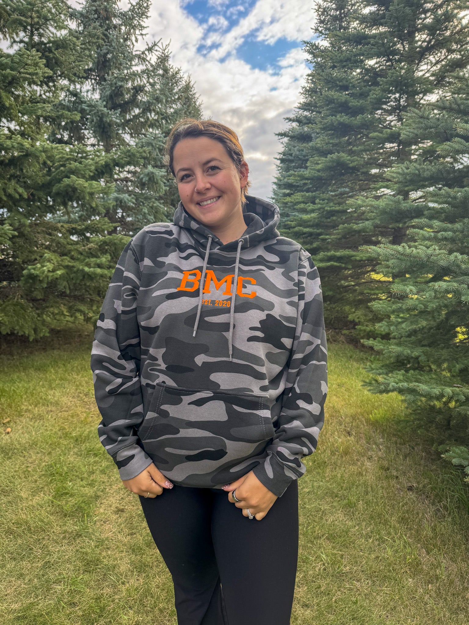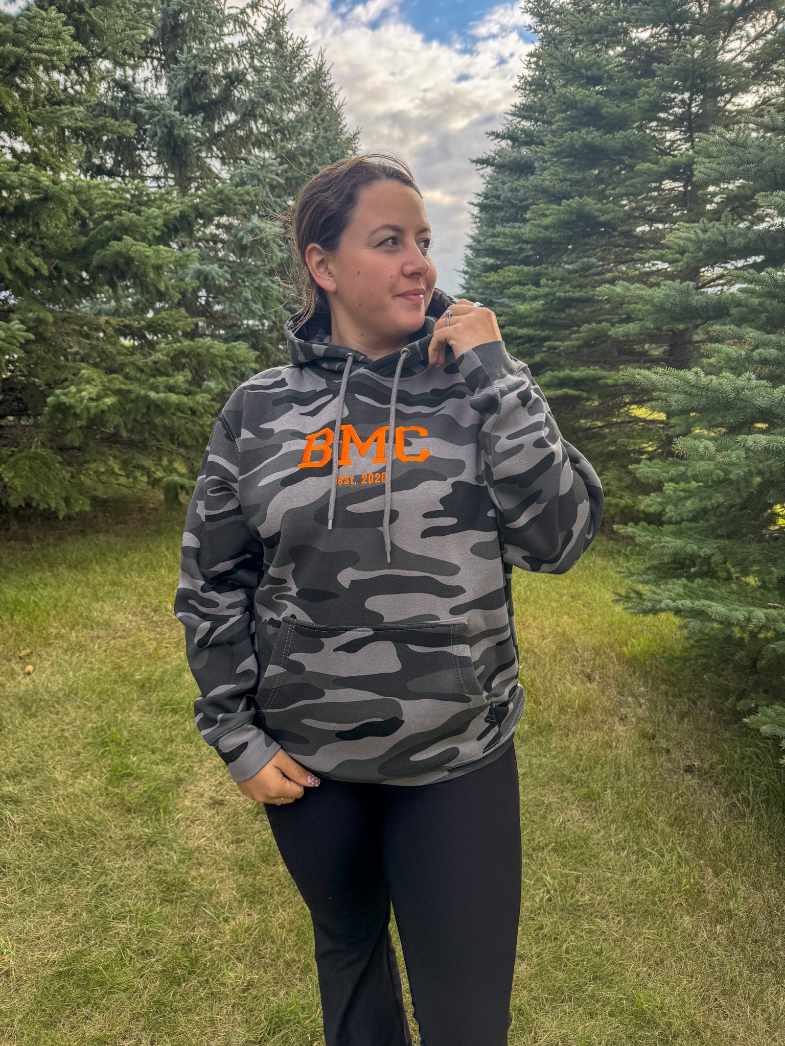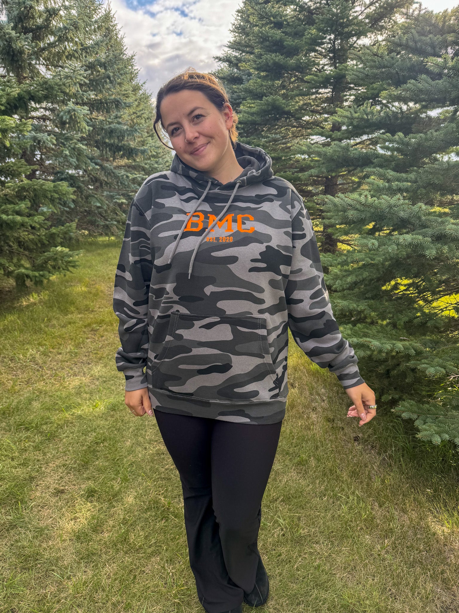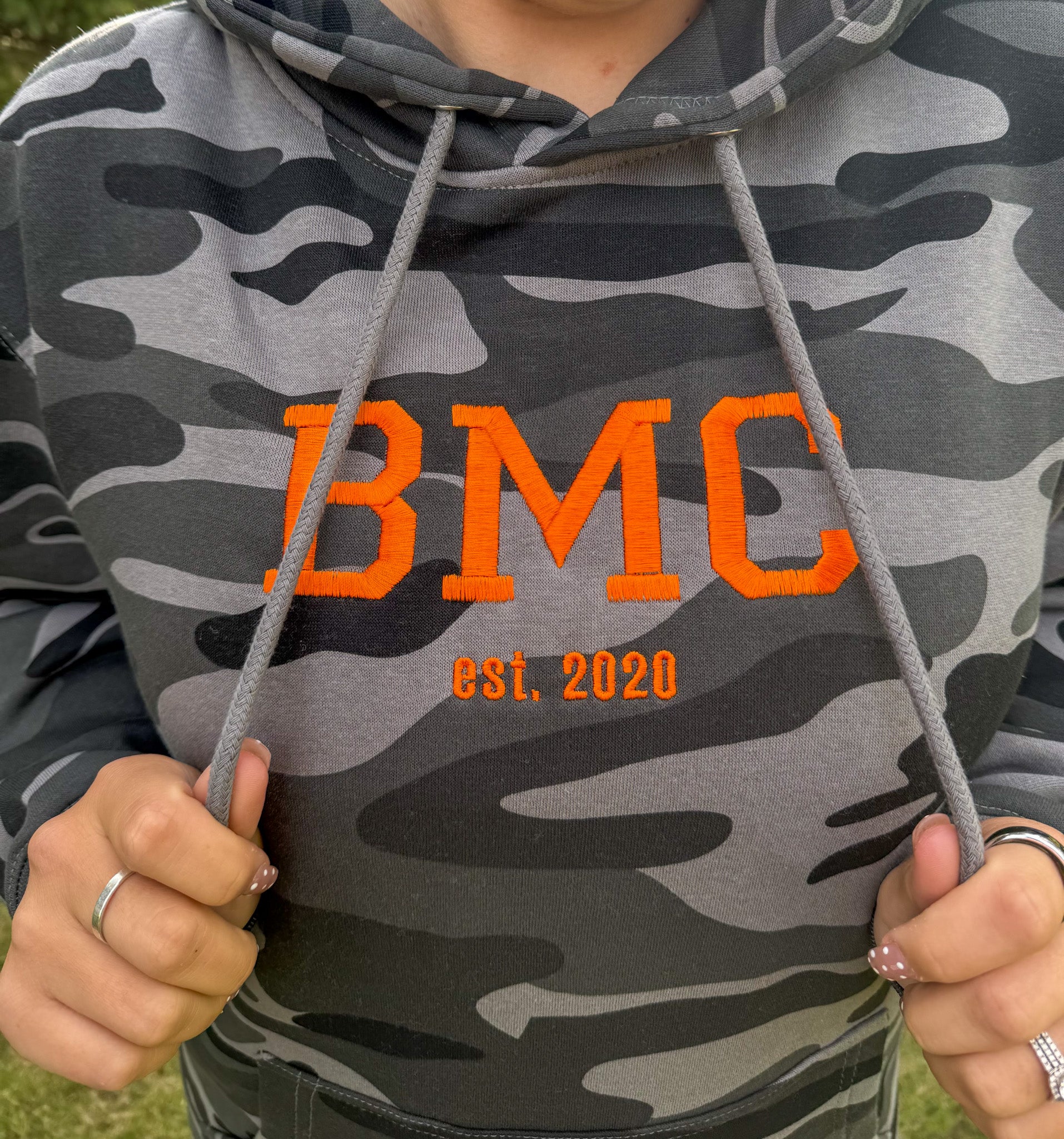 Stay cozy and bold in this Camo BMC Hoodie, featuring bright orange embroidered “BMC est. 2020” details that pop against the classic camo print. True to size fit makes it perfect for layering or lounging with a playful edge.