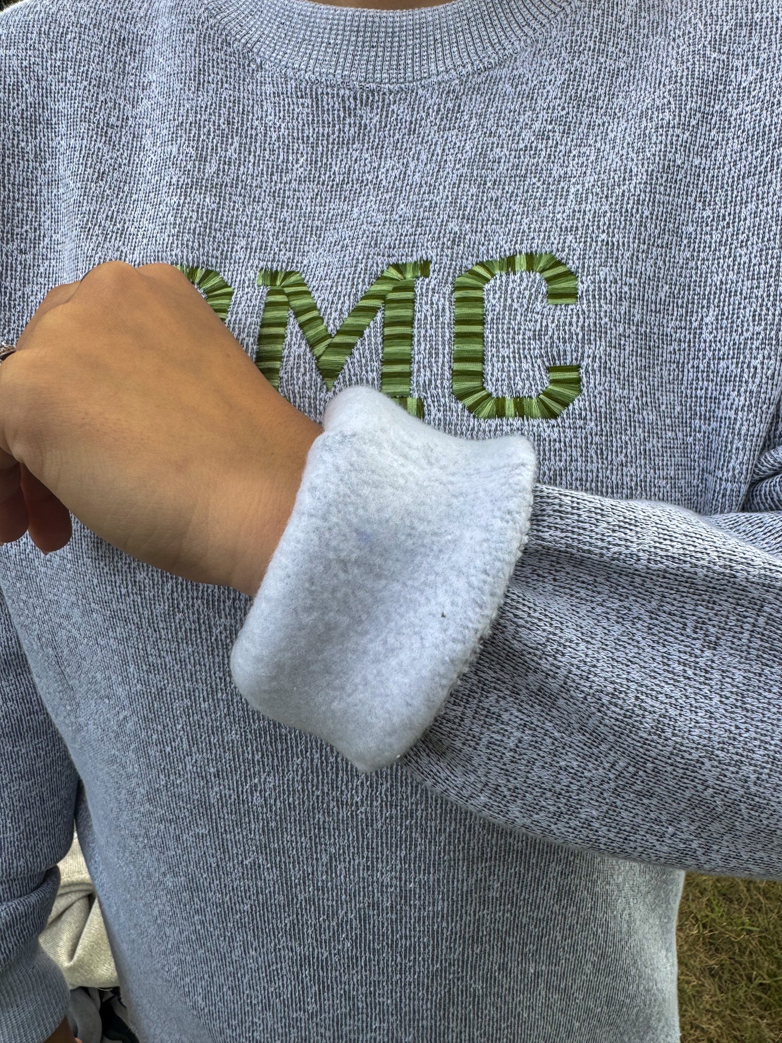 Salt & Pepper Lane Seven Unisex Crewneck with Ombre Green & Cream Thread.